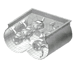 雙軸臥式葉片混合機(jī)是一種強(qiáng)制式、間斷性卸料攪拌裝置,廣泛用于攪拌建材、煤化工及化肥行業(yè)中各類粉末狀或顆粒狀物料。攪拌裝置采用緊湊型設(shè)計(jì),混合機(jī)由傳動(dòng)系統(tǒng)、攪拌缸、攪拌軸系、機(jī)架等部分組成。攪拌缸由攪拌槽、襯板、機(jī)罩等組成。進(jìn)料口、收塵口設(shè)置在機(jī)罩上,卸料門設(shè)置在攪拌槽下方。“ω”型攪拌槽內(nèi)裝有兩根水平布置的攪拌軸,軸上分別裝有攪拌臂,攪拌葉片分布在攪拌臂上,相鄰攪拌臂間的夾角有45°、60°、90°、120°、135°和180°。夾角根據(jù)不同需要進(jìn)行設(shè)計(jì)。一般45°和60°夾角是針對(duì)大型和特大型攪拌裝置的。攪拌軸上葉片的安裝方式有很多種,但是不能使其形成促使物料向一端移動(dòng)的傾斜裝置。 因此各攪拌葉片若是傾斜布置,應(yīng)是兩攪拌軸上攪拌葉片左、右旋向交替,可在局部范圍內(nèi)加大物料的對(duì)流。在靠近攪拌槽兩端的攪拌臂上分別裝有反向葉片,其目的是用來(lái)清理端面上積聚的物料。攪拌軸上安裝攪拌臂的部分為四面體型設(shè)計(jì),便于攪拌臂的周向定位。攪拌葉片與攪拌臂之間螺栓連接,便于更換。