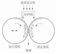 對(duì)輥壓球機(jī)是發(fā)展較早、應(yīng)用多的壓團(tuán)法設(shè)備,因其對(duì)原料粒度要求低、成球質(zhì)量高、可用有機(jī)粘結(jié)劑,且有機(jī)粘結(jié)劑在燃燒過程中可以提供部分熱量, 燃燒產(chǎn)物少,不會(huì)影響到直接還原后產(chǎn)品品質(zhì),對(duì)輥壓球機(jī)是轉(zhuǎn)底爐工藝中普遍應(yīng)用的原料成球設(shè)備。