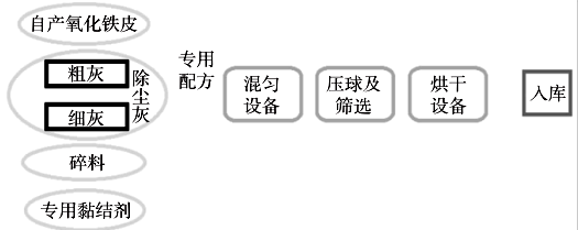 通過提高氧化鐵皮含量提高壓球含鐵量。設(shè)計(jì)配比試驗(yàn),在不影響成球率的基礎(chǔ)上,改變粗細(xì)氧化鐵皮配比,可以穩(wěn)定壓球含鐵量。調(diào)整烘烤時(shí)間、物料分層烘烤以提高日產(chǎn)量,降低壓球含水量,提高壓球強(qiáng)度。黏結(jié)劑中可含部分增加冷固球團(tuán)強(qiáng)度、阻止黏結(jié)劑氧化且對鋼水成分不造成影響的無機(jī)物。工藝路線圖如下: