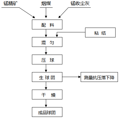 冷壓球團生產(chǎn)技術是利用粘結劑, 將含錳物料和煤等在常溫下利用專用壓球設備壓制成型, 進行烘干( 200 ℃) 后直接入爐冶煉?;A工藝流程如下圖。