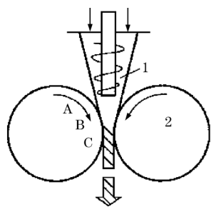 采用強力加料對組份多、比重相差大的錳粉礦壓制球團比較合適。強力加料除有加料作用外, 還對物料有預壓作用, 破壞物料的“達橋效應”, 排除物料中的部分氣體, 如圖所示, 物料在A 處填滿球窩, 在 B、C 處由于螺旋的作用物料只能強迫地留在球窩內(nèi),隨著對輥轉動脫出球窩, 在之前始終是充滿的。
