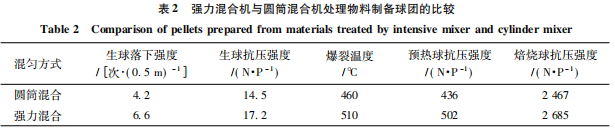 分別將圓筒混合機和強力混合機處理的鐵精礦用于造球、預熱和焙燒,其結(jié)果比較如下表所示: 在使用強力混合機進行混合后,球團的各項指標均有不同程度的提高,尤其是生球強度,提高的效果十分顯著,主要原因是強力混合機使膨潤土在物料中分散得更加均勻,顆粒與顆粒之間黏結(jié)得更加緊密,從而提高了生球的落下強度和抗壓強度,預熱球及焙燒球抗壓強度分別提高 66、118 N/P。