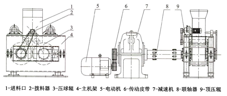 壓球機是生產(chǎn)線的關(guān)鍵設(shè)備,其主體結(jié)構(gòu)是一對相向轉(zhuǎn)動的壓輥,其中一個壓輥是固定安裝的,另一個壓輥為活動輥,通過液壓系統(tǒng)支撐在機架上,壓輥的表面有定制的模具,當(dāng)物料定量連續(xù)進入或通過預(yù)壓機強制進入壓輥中間時,物料就被壓縮成型。